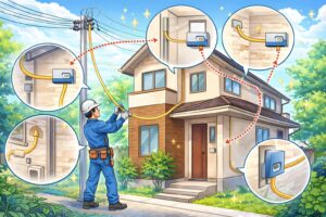 この記事では、戸建ての引き込み工事の基本ルートから、設置場所の選び方、申し込み前に伝えたいことまで、やさしく整理してお伝えします。工事後に困らないように、家に合った進め方を一緒に確認していきましょう。