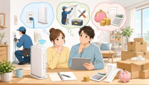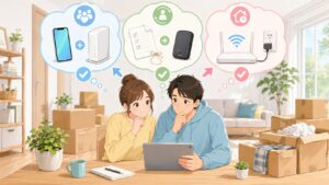 工事不要で使える回線を知りたい人は、「工事不要ですぐ使えるホームルーターは引っ越し時に向いている?」の記事で確認すると、次の判断がしやすくなります。