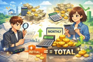 料金は「安そう」に見えても、実際は初期費用が足されます。まずは同じ期間(例:24か月)で、初期費用+月額の合計を出しましょう。初期費用には契約事務手数料や工事費が入り、土日工事の追加費用などがある回線もあります。