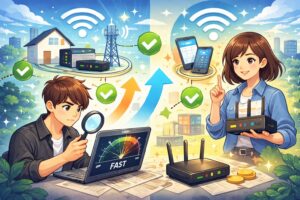 まずは住所でエリア判定→次に機器の対応確認、の順で選ぶとムダがありません。Wi-Fiだけで使う場合も、端末が古いと性能を活かせません。まずは「困っているのは速度か、Wi-Fiの電波か」を切り分けてから決めると安心です。