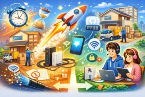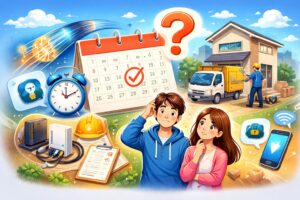 最短で間に合わせるコツは、「申し込み」と「つなぎ」を同時に進めることです。光回線は工事まで2週間〜1か月かかることがあるので、入居日が近いときは先に工事不要のWi-Fiを用意すると安心です。