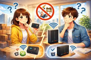 - 置き型(ホームルーター):家のコンセントに挿して、端末の案内どおりに接続するだけでWi-Fiが作れます。工事がいらないので、入居日にすぐネットがほしい人に向きます。